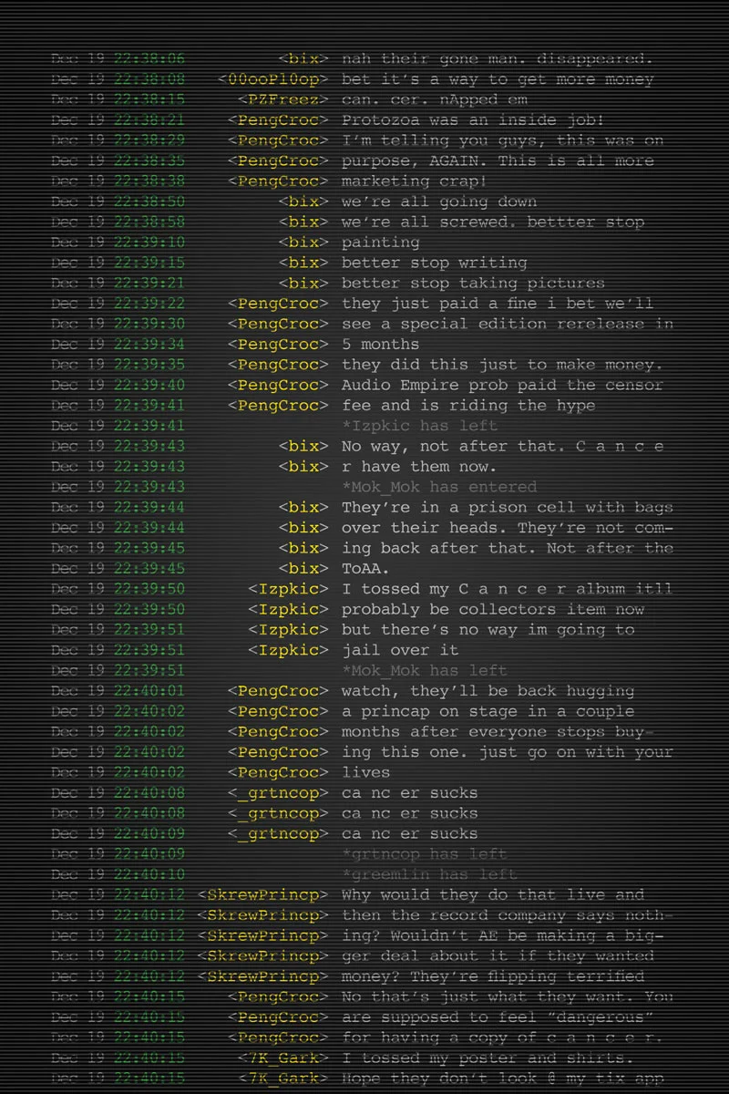 The art book accompanying the album helped to tell the story of Cancer. It contained sketches of band merch, news reports from the world, transcripts, screenshots of forum postings, and other artifacts that made the world come alive.